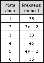 Diketahui tabel hasil percobaan pelemparan dadu sebanyak 225 kali dengan 6 sisi sebagai berikut