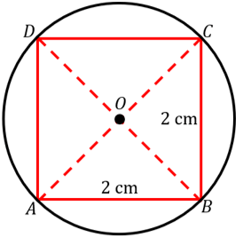 Diketahui terdapat sebuah persegi di dalam lingkaran. Jika sisi persegi tersebut 2 cm dan titik potong diagonal persegi tersebut sama dengan titik pusat lingkaran, maka luas lingkaran tersebut adalah ....