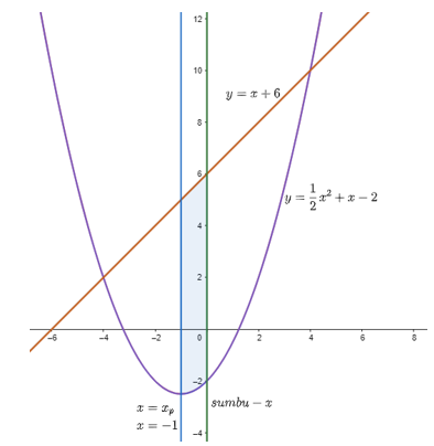 Diketahui titik adalah titik puncak dari parabola . Diketahui garis y = x + 6 memotong grafik fungsi kuadrat salah satunya pada absis x = - 4. Luas daerah dibentuk oleh parabola dan garis tersebut yang dibatasi oleh garis dan sumbu - y adalah...