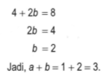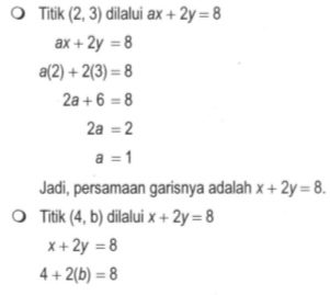 Diketahui titik-titik (2, 3) dan (4, b) dilalui oleh persamaan garis ax + 2y = 8, nilai a + b adalah ....