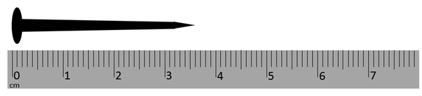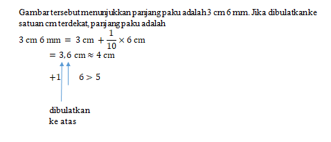 Dimas mengukur panjang sebuah paku dengan menggunakan penggaris. Hasil pengukuran paku ditunjukkan pada gambar. Panjang paku jika dibulatkan dalam satuan cm terdekat adalah ....