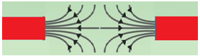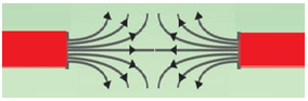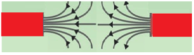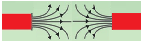 Dina dan Nana masing-masing memiliki sebuah magnet batang. Dina mendekatkan kutub selatan magnetnya dengan kutub utara magnet Nana. Penggambaran garis gaya magnet yang tepat adalah …. (Asumsikan magnet sebelah kiri adalah magnet Dina dan magnet sebelah kanan adalah magnet Nana)