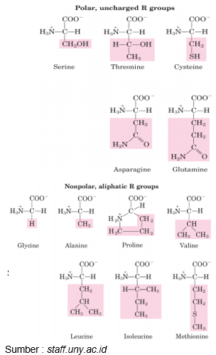 - Asam amino polar : Lisin, serin, treonin, sistein, tirosin, aspargin, glutamin