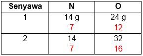 Disajikan data dua oksida nitrogen yang tersusun atas nitrogen dan oksigen dengan komposisi sebagai berikut.