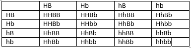 Disilangkan sapi berbulu hitam berbadan besar (HHBB) dominan, dengan sapi berbulu putih berbadan kecil (hhbb) dan dihasilkan keturunan pertama (F1) sapi berbulu hitam berbadan besar (HhBb) semua, jika F1 disilangkan dengan sesamanya berapakah presentase hasil keturunan F2 yang berbulu putih dan berbadan besar?