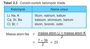 massa atom unsur kedua adalah setengah dari jumlah massa atom unsur pertama dan ketiga