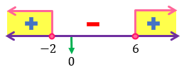 Didapat saat x=0, daerah pada garis bilangan bernilai negatif sehingga daerah di sebelah kiri −2 dan di sebelah kanan 6 akan bernilai positif (selang-seling).