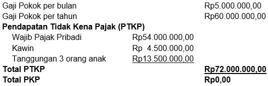 Doni seorang karyawan swasta yang rajin. Setiap bulan ia mendapatkan gaji sebesar Rp 5.000.000. Doni telah menikah dan memiliki 3 orang anak. Hitunglah besarnya PPh terutang dalam satu tahun pajak!