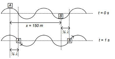 Dua balok kayu kecil A dan B terapung di permukaan danau. Jarak keduanya adalah 150 cm. Ketika gelombang sinusoida menjalar pada permukaan air teramati bahwa pada saat t = 0 detik, balok A berada di puncak, sedangkan balok B berada di lembah. Keduanya dipisahkan satu puncak gelombang. Pada saat t = 1 detik, balok A berada di titik setimbang pertama kali dan sedang bergerak turun. Manakah pernyataan yang benar tentang gelombang pada permukaan air tersebut?