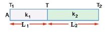 Dua batang besi dengan luas penampang A memiliki panjang dan , serta koefisisen konduktivitas termal dan . Kedua batang besi dihubungakan hingga terjadi keseimbangan termal dengan suhu pada bagian sambungan batang. Jika suhu bagian ujung batang pertama adalah dan suhu bagian ujung batang kedua adalah . Maka selisih kedua suhu pada bagian ujung batang adalah ....