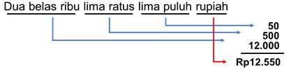 Dua belas ribu lima ratus lima puluh rupiah, jika ditulis dalam bentuk nominal yang benar adalah ....