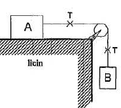 Dua benda A dan B masing-masing 2 kg dan 3 kg dihubungkan dengan tali melalui katrol seperti pada gambar. Jika lantai dan gesekan antar tali diabaikan, dan B bergerak turun, maka besar tegangan tali adalah ...