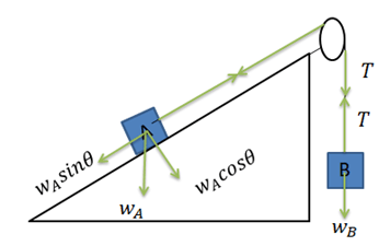 Jika percepatan sistem 1,5 , dan Massa benda A dan B masing-masing adalah adalah 4 kg dan 2 kg. Hitunglah gaya normal benda A dan besar tegangan tali ! (g = 10 ).