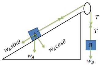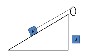 Massa benda A dan B masing-masing adalah adalah 4 kg dan 3 kg yang memiliki percepatan sistem sebesar 2 . Besar koefisien gesekan kinetik antara balok dan bidang adalah .... (g = 10 ).