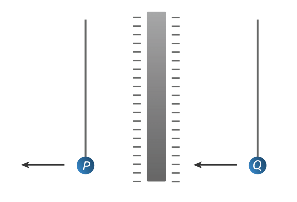 Dua bola sangat ringan bermuatan P dan Q digantungkan pada ujung benang-benang nilon. Ketika sebuah batang bermuatan negatif diletakkan di antara keduanya, P ditolak dan Q ditarik seperti gambar berikut.