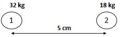 Dua buah benda diletakkan dalam satu garis lurus yang terpisah sejauh 5 cm. Massa kedua benda masing-masing sebesar 32 kg dan 18 kg seperti gambar dibawah ini.