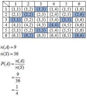Dua buah dadu dilempar undi secara bersama-sama satu kali. Peluang munculnya jumlah mata dadu habis dibagi 4 adalah....