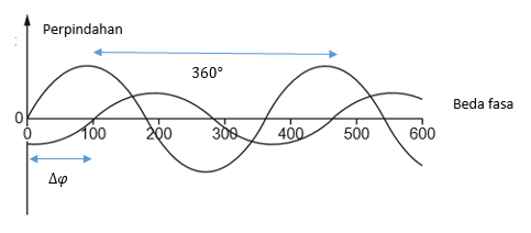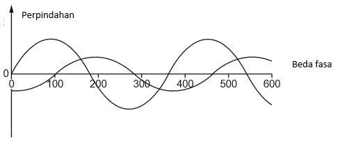 Dua buah gelombang dengan frekuensi yang sama bergerak seperti gambar di atas. Besarnya nilai beda fasa antara 2 gelombang tersebut adalah ….