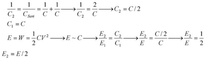 Dua buah kapasitor identik mula – mula belum bermuatan akan dihubungkan dengan baterai 10 V. Bila hanya salah satunya saja yang dihubungkan dengan baterai 10 V tersebut, energi yang tersimpan dalam kapasitor adalah E. Energi yang akan tersimpan bila kedua kapasitor tadi dihubungkan secara seri dengan baterai adalah ... .(UMPTN 2001 Rayon A)
