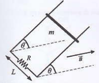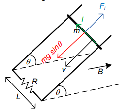 Dua buah kawat konduktor yang sejajar dan berjarak L = 1 m dipasang membetuk sudut terhadap bidang horizontal. Ujung bawah kedua kawat terhubung dengan sebuah resistor . Sebuah batang konduktor sengan massa m bergeser turun di sepanjang rel, tanpa kehilangan kontak dengan rel sehingga rel dan batang membentuk suatu rangkaian tertutup. Pada daerah tersebut terdapat medan magnetik seragam yang besarnya B=2T dan berarah horizontal. Jika batang turun dengan laju konstan , massa batang m adalah....