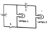 Dua buah lampu dihubungkan dengan sebuah sumber tegangan dan sebuah kapasitor seperti pada gambar. Setelah saklar S ditutup dalam waktu yang cukup panjang, yang akan terjadi adalah ..