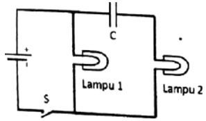 Dua buah lampu dihubungkan dengan sebuah sumber tegangan dan sebuah kapasitor seperti pada gambar.