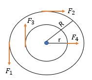 Dua buah lingkaran yang seporos memiliki jari-jari r = 20 cm dan R = 50 cm dikenai beberapa gaya seperti berikut ini.