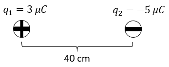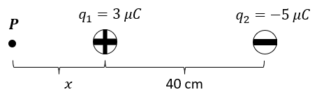 Dua buah muatan listrik masing-masing besarnya +3 μC dan -5 μC terpisah pada jarak 40 cm. Di manakah letak titik P yang mempunyai kuat medan listrik sama dengan nol?