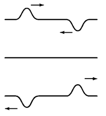 Dua buah pulsa identik bergerak dengan arah berlawanan pada seutas tali. Semua parameter gelombang sama kecuali satu pulsa mempunyai pergeseran simpangan positif dan satunya negatif. Pada saat dan setelah kedua pulsa bertemu seluruhnya, pernyataan yang benar adalah ….