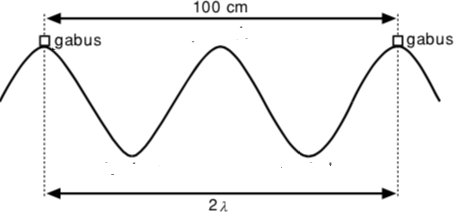 Dua gabus berada di puncak-puncak gelombang. Keduanya bergerak naik turun di atas permukaan air laut sebanyak 20 kali dalam waktu 4 detik mengikuti gelombang air laut. Jika jarak kedua gabus 100 cm dan di antaranya terdapat dua lembah dan satu bukit, berapa frekuensi gelombang dan cepat rambat gelombang?