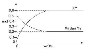 Kedua gas dipanaskan dalam wadah tertutup bervolume satu liter hingga reaksi mencapai kesetimbangan. Grafik berikut ini menunjukkan hubungan antara jumlah mol masing-masing gas dan perubahan waktu.