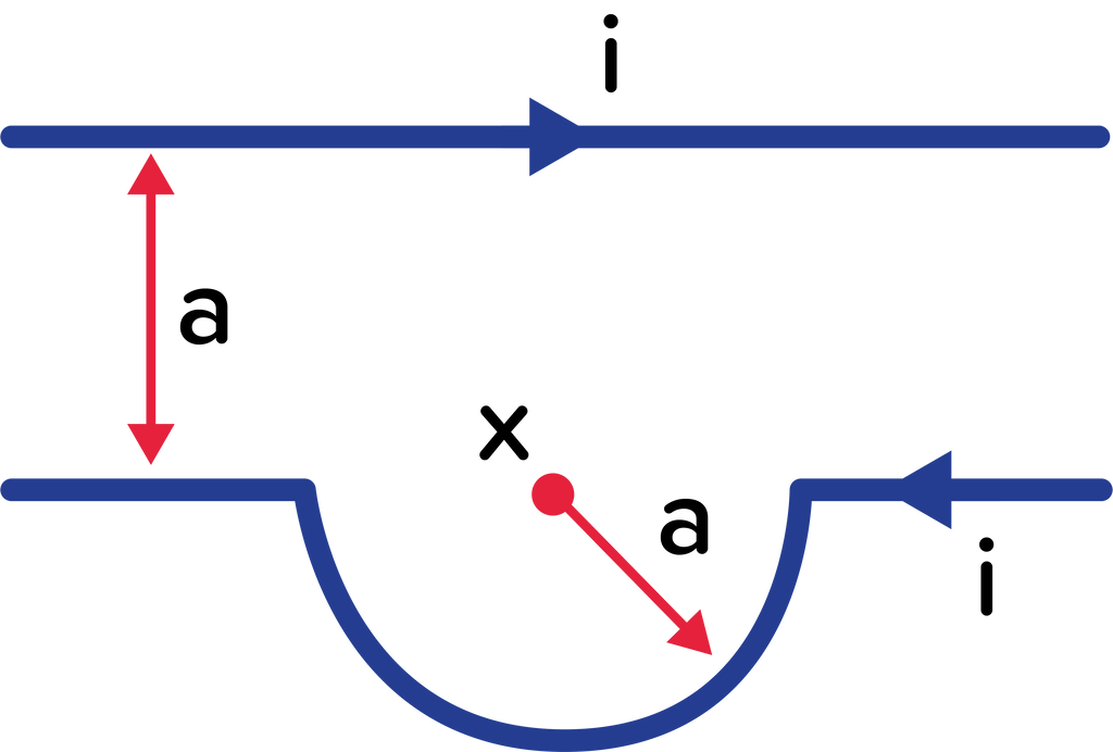 Kedua kawat memanjang pada suatu garis lurus yang sangat panjang. kawat pertama memiliki suatu loop setengah lingkaran berjari-jari a dan berpusat di titik x. Pernyataan yang tepat bagi medan magnetik di pusat x adalah ....