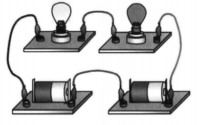 Dua lampu pijar dengan ukuran yang sama dirangkai seri. Lampu tersebut dicat dengan warna hitam dan putih.