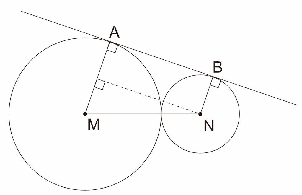 Dua lingkaran berpusat di M dan N saling bersinggungan luar. Kedua lingkaran disinggung oleh garis di titik A dan B. Jika AM = 9 cm dan BN = 4 cm, maka panjang garis singgung AB adalah ....