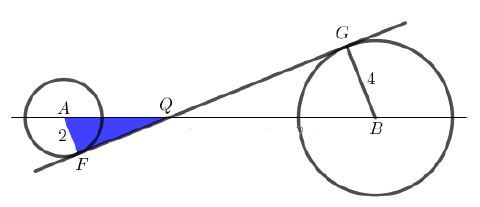 Dua lingkaran dan berpusat pada sumbu X dengan radius = 2 dan = 4. Suatu garis singgung dalam dari kedua lingkaran tersebut menyinggung di F dan menyinggung