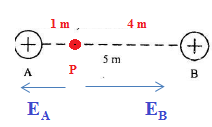 Dua muatan A dan B yang besarnya masing-masing 3 C dan 8 C berada pada posisi seperti pada gambar. Besarnya kuat medan listrik pada suatu titik yang berjarak 1 m dari A dan 4 m dari B dalam garis hubung adalah ….