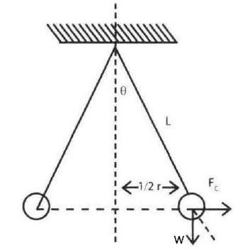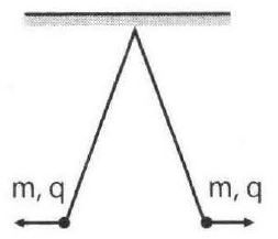 Dua muatan yang sejenis dengan besar muatan sama, yaitu dan besarnya massa masing-masing sama, yaitu , masing-masing di ikat pada seutas tali panjangnya masing-masing sama, yakni . Akibat tolakan gaya Coulomb dan tarikan gaya berat, kedua partikel dalam keadaan setimbang. Berapa besarnya jarak antara kedua muatan?