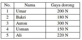 Beberapa temannya akan membantu dengan gaya yang dimiliki masing-masing seperti pada tabel. Dan mobil dengan jalan terdapat gaya gesekan sebesar 400 N. Jika mobil akan dipindahkan sejauh 10 m dengan usaha 6000 joule, maka tiga orang yang paling tepat untuk membantu adalah ..