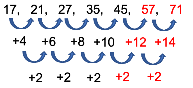 Dua suku berikutnya dari barisan 17, 21, 27, 35, 45, ... adalah ...