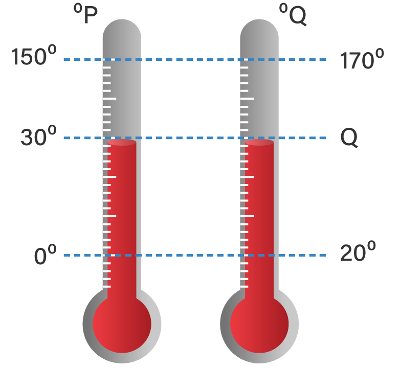 Dua termometer P dan Q memiliki prinsip kerja yang sama, tetapi skalanya berbeda. Batas bawah dan batas atas skala termometer P berturut-turut adalah 0°P dan 150°P dan dibagi menjadi 150 skala, sedangkan batas bawah dan batas atas skala termometer Q berturut-turut adalah 20°Q dan 170°Q dan dibagi menjadi 150 skala. Jika termometer P menunjukkan angka 30°P, saat itu termometer Q menunjukkan angka ...