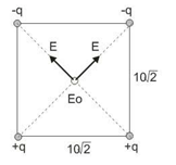 Empat buah muatan diletakkan di setiap sudut persegi yang panjang sisinya 10cm. Jika O adalah titik perpotongan diagonal, maka kuat medan listrik di titik O adalah …. (q = 10 μC)