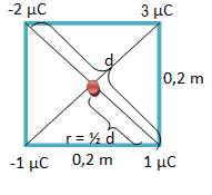Empat buah partikel masing-masing memiliki muatan q1 = -2 μC, q2 = 3 μC, q3 = 1 μC, q4 = -1 μC terletak di sudut-sudut suatu bujur sangkar yang panjang sisinya 0,2 m. Jika diketahui adalah permitivitas vakum dan bujur sangkar berada di suatu medium yang memiliki permitivitas relatif 2, maka besar potensial listrik di pusat bujur sangkar tersebut adalah … .