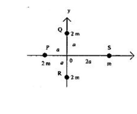 Empat buah partikel terletak pada sistem koordinat kartesius seperti gambar. Momen inersia sistem partikel terhadap pusat koordinat (0,0) adalah ....