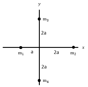 Massa masing-masing partikel adalah m1 = m2 = 4m, m3 = 2m, dan m4 = m. Jika sistem diputar terhadap sumbu y, momen inersia sistem tersebut adalah ….