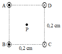 Arah arus adalah keluar bidang gambar di titik A dan B (ditunjukkan oleh tanda •) dan masuk ke bidang gambar di titik C dan D (ditunjukkan oleh tanda