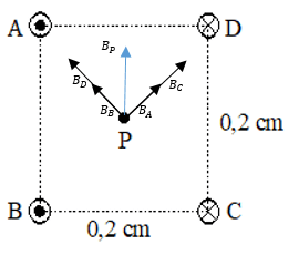 Empat penghantar sejajar yang sangat panjang masing-masing mengalirkan arus i = 4 A. Titik pusat keempat kawat membentuk bujur sangkar seperti tampak pada gambar di bawah.