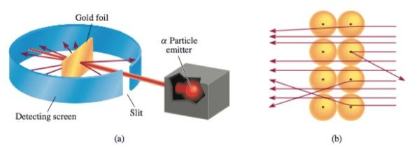 Ernest Rutherford melakukan eksperimen dengan menembakkan sinar α pada lempengan emas seperti terlihat dalam gambar (a). Hasil yang diperoleh dapat dilihat pada gambar (b). Dari hasil yang didapat, diperoleh kesimpulan bahwa….