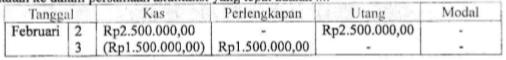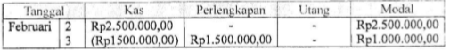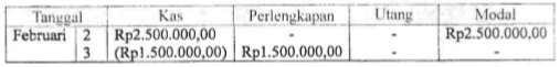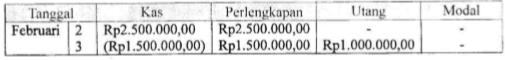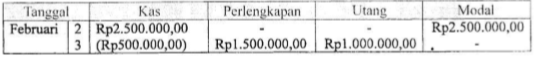 3 Februari 2012 dibeli perlengkapan senilai Rp1.500.000,00 baru dibayar Rp500.000,00 dari Toko Dinda.