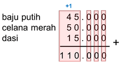 Fian pergi bersama ayah ke toko baju seragam sekolah. Beberapa barang yang dijual di toko tersebut beserta harganya adalah sebagai berikut: baju putih Rp45.000, celana merah Rp50.000, dasi Rp15.000, topi Rp20.000, serta sabuk hitam Rp12.000 . Ayah membelikan seragam sekolah baru untuk Fian berupa 1 potong baju putih, 1 potong celana merah, dan 1 buah dasi. Banyaknya uang yang harus dibayarkan Ayah adalah....