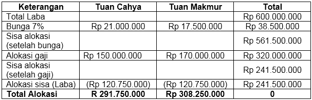 Firma Cahaya Makmur yang dimiliki oleh Tuan Cahya dan Tuan Makmur membagi laba tahun 2020 setelah persekutuan dijalankan selama setahun. Modal yang dikeluarkan Tuan Cahya adalah Rp 300.000.000,00, sedangkan modal Tuan Makmur adalah Rp 250.000.000,00. Jika disesuaikan dengan anggaran dasar pembagian laba firma tersebut adalah sbb :